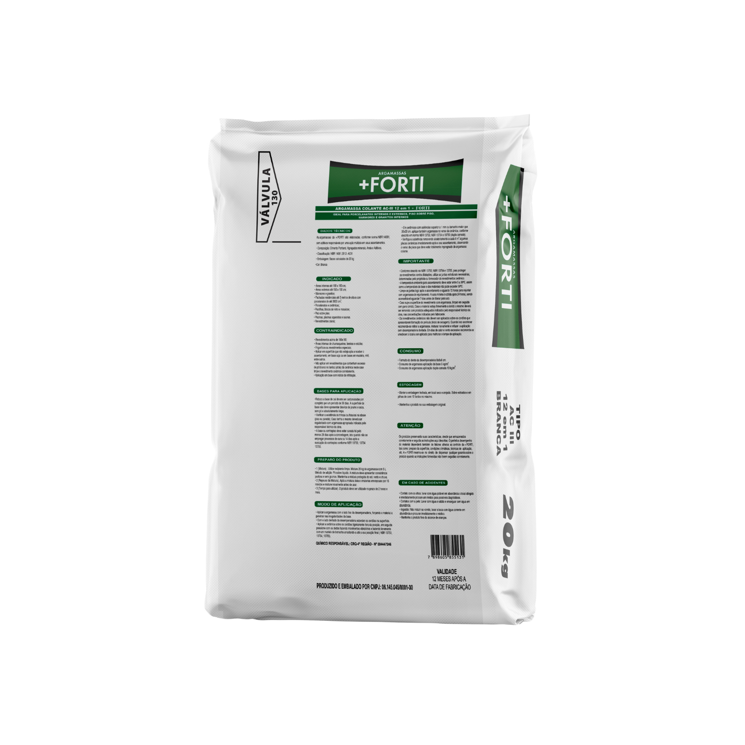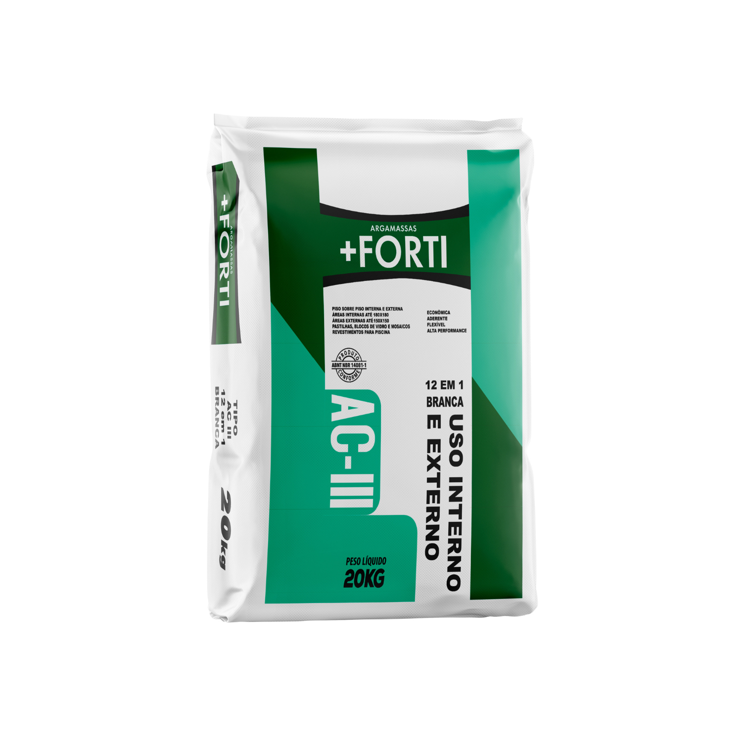 A Argamassa +FORTI, tipo AC3 12 em 1 branca é um produto industrializado conforme a norma ABNT NBR 14081 e é indicada para assentamento em pisos e paredes internas e externas, no assentamento de revestimentos cerâmicos em áreas secas e molhadas e assentamentos especiais do tipo piso sobre piso, pastilhas, blocos de vidro, nichos e mosaicos.