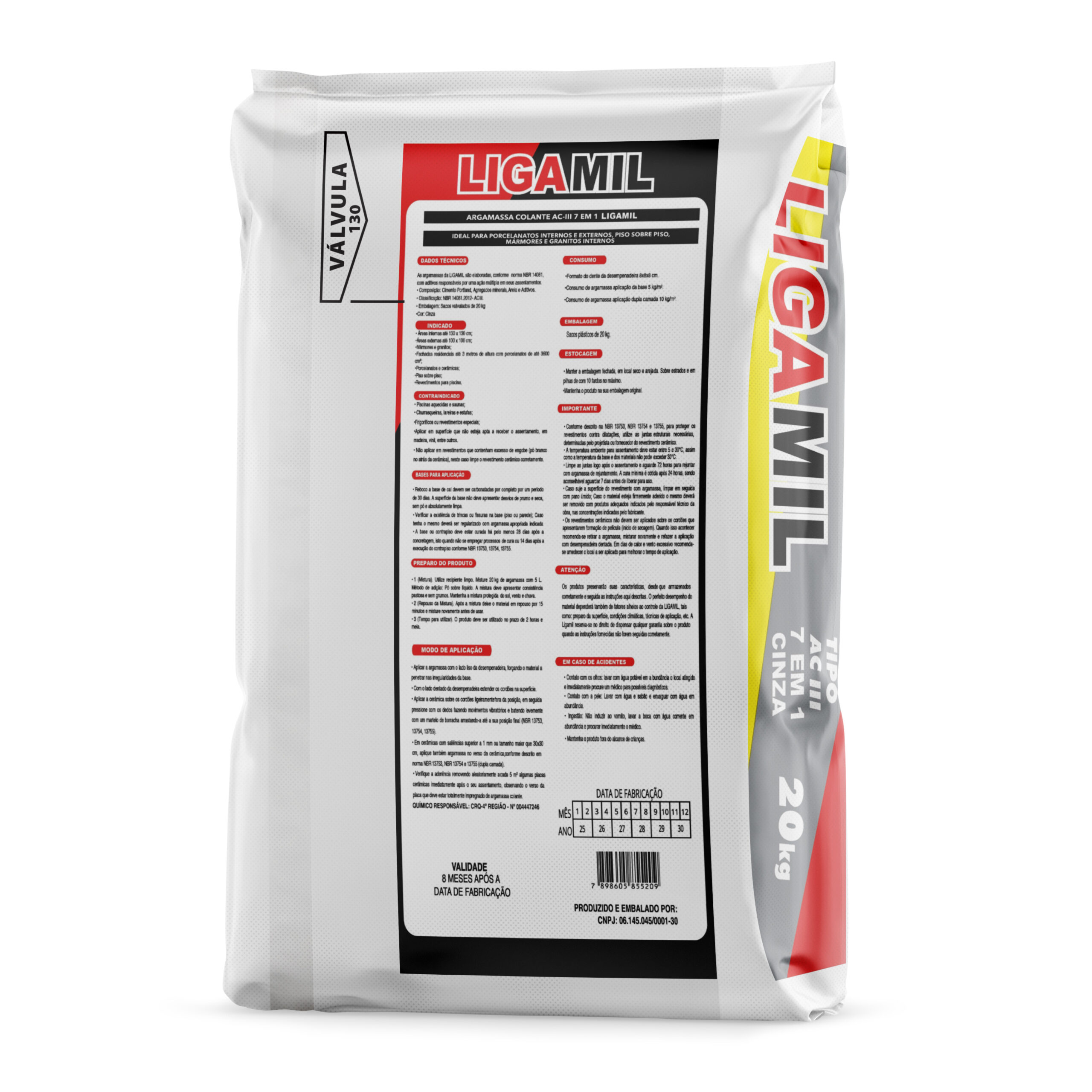 A Argamassa LigaMil, tipo AC3 7 em 1 é um produto industrializado conforme a norma ABNT NBR 14081 e é indicada para assentamento em pisos e paredes internas e externas, no assentamento de revestimentos cerâmicos em áreas secas e molhadas e assentamentos especiais do tipo piso sobre piso.